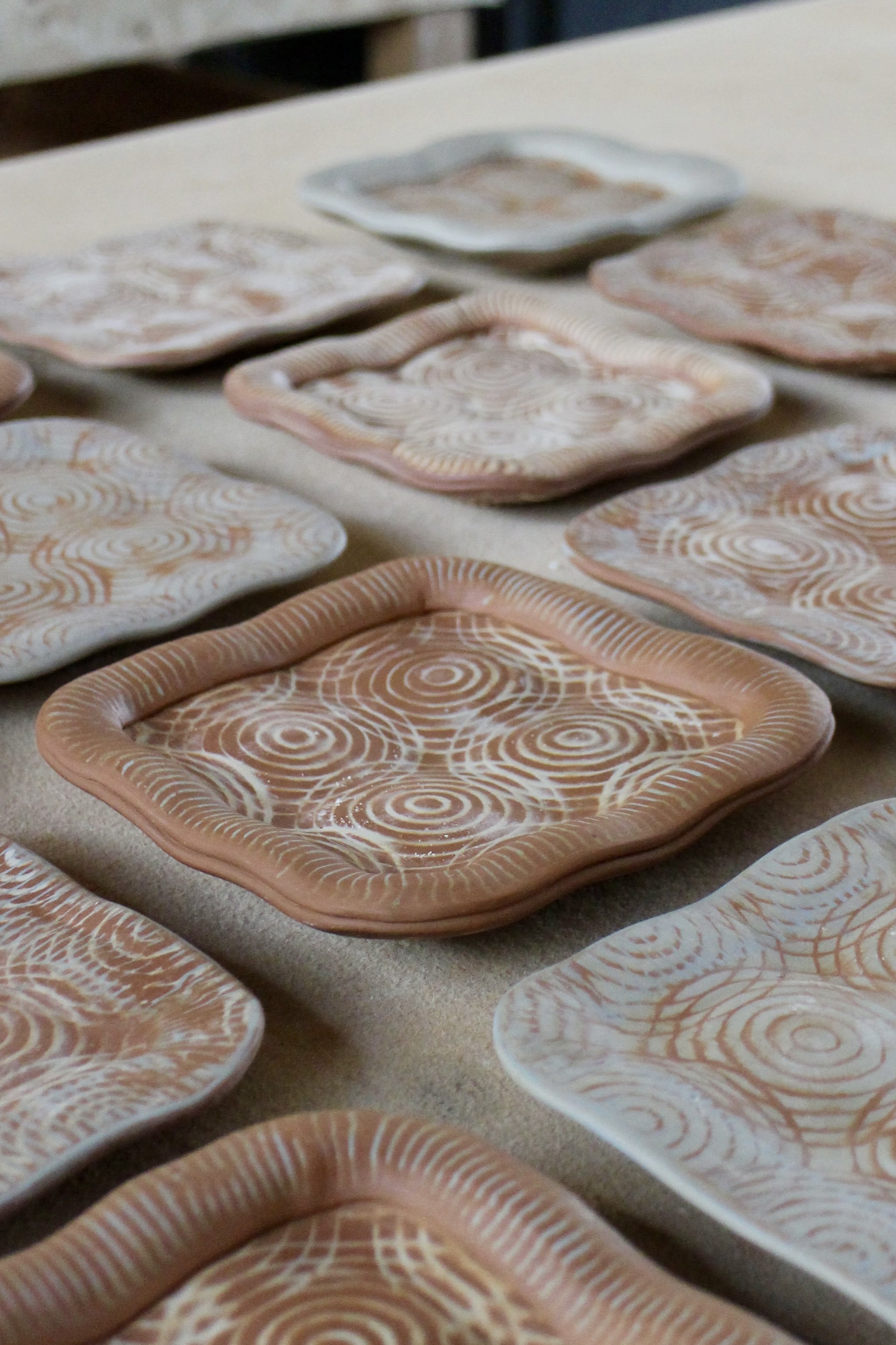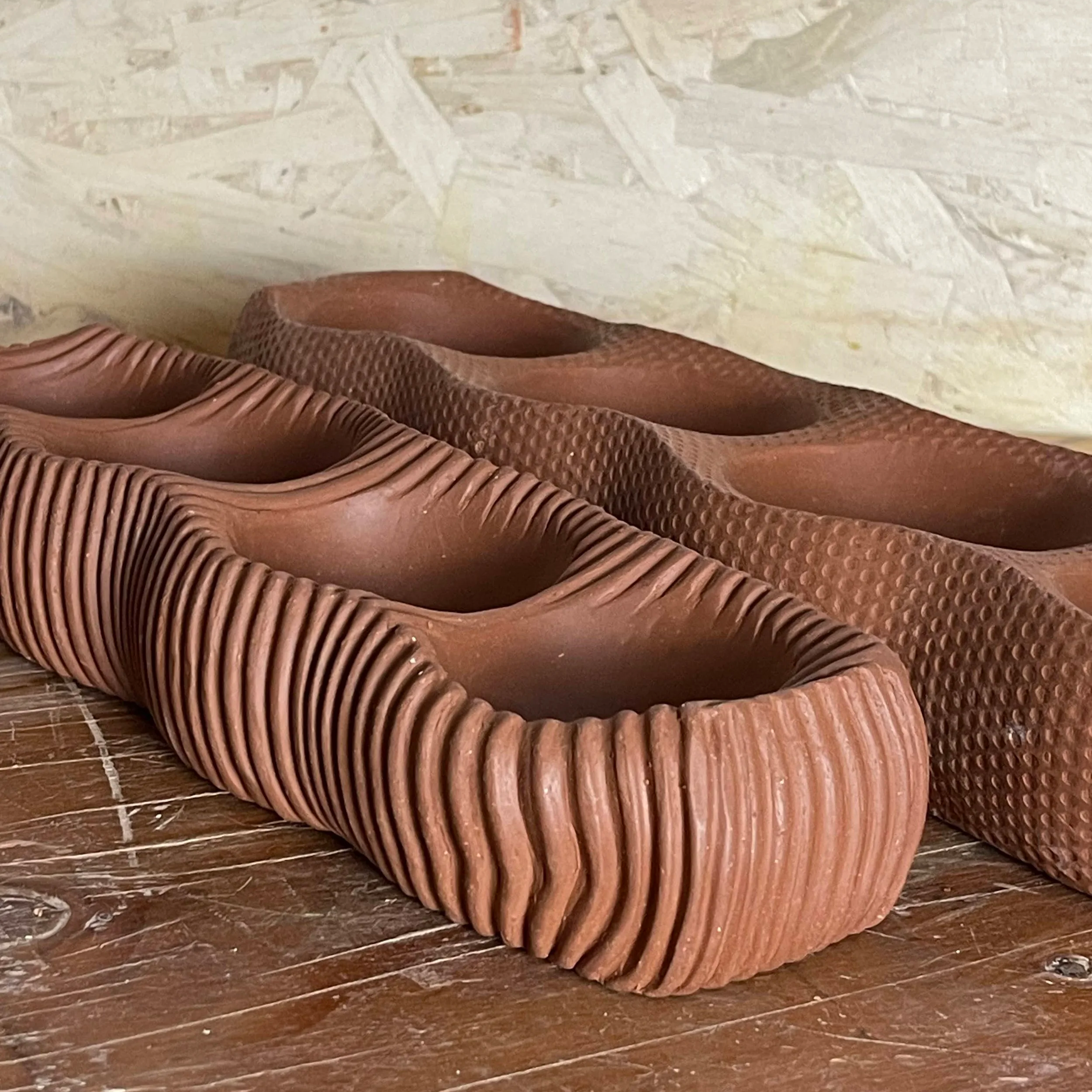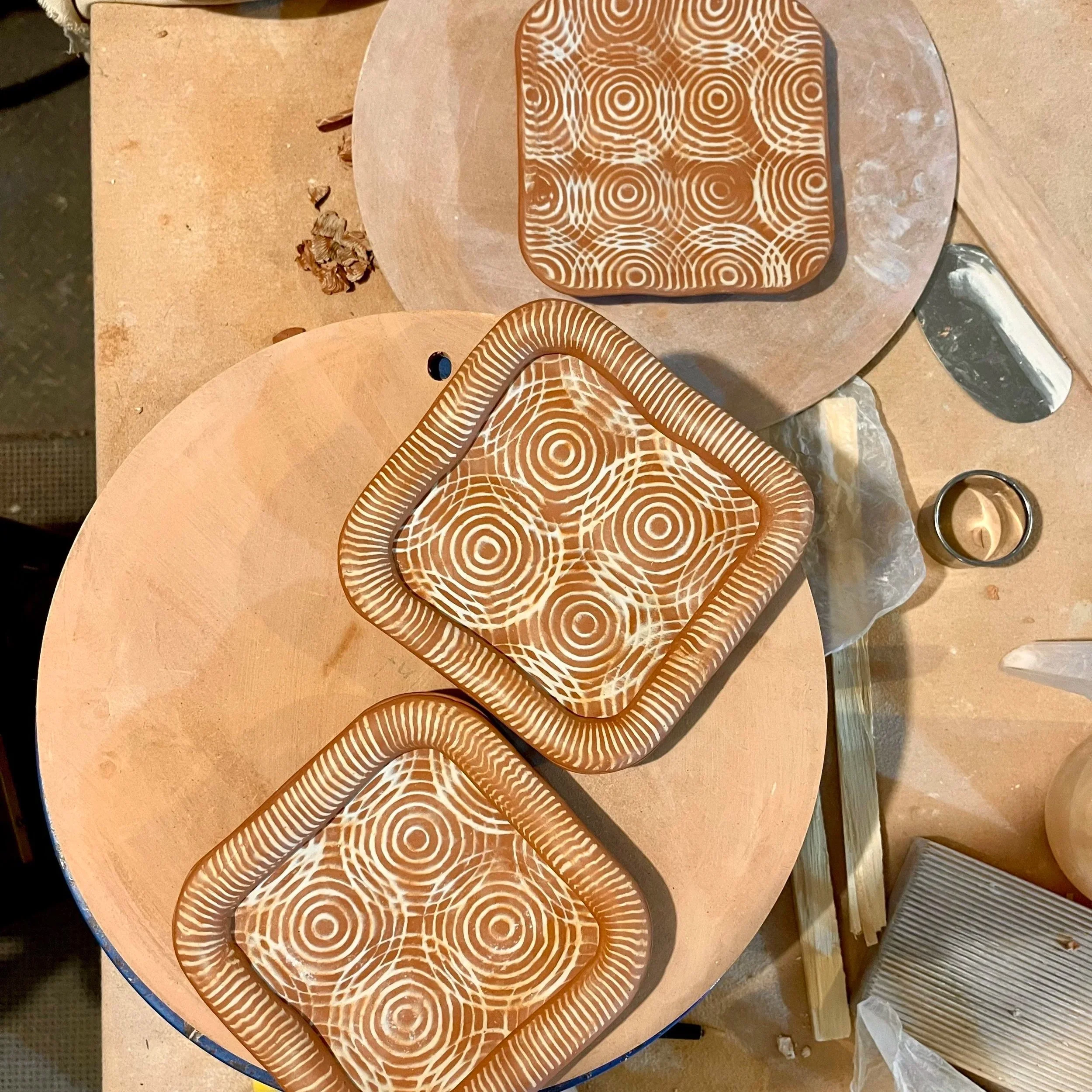 I make elongated trays and cubes, where I’m interested in how pattern, texture, and silhouette shift as shapes are pressed into the clay. These works feel successful when pattern and silhouette align, and when the form reflects the gesture that created it.