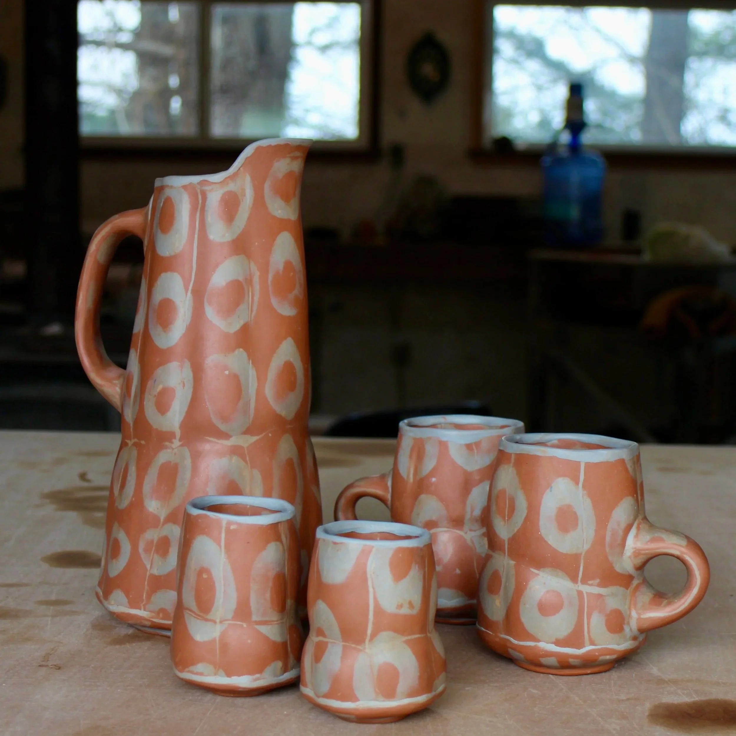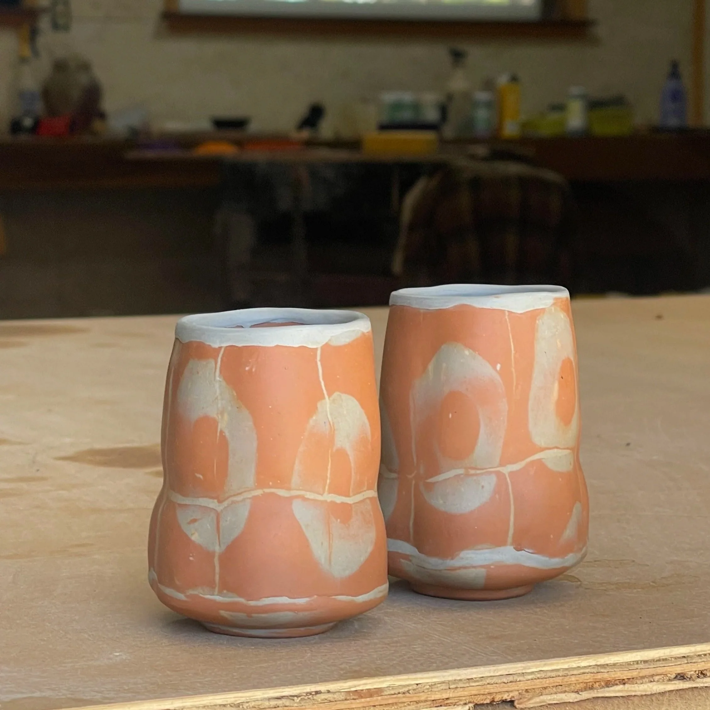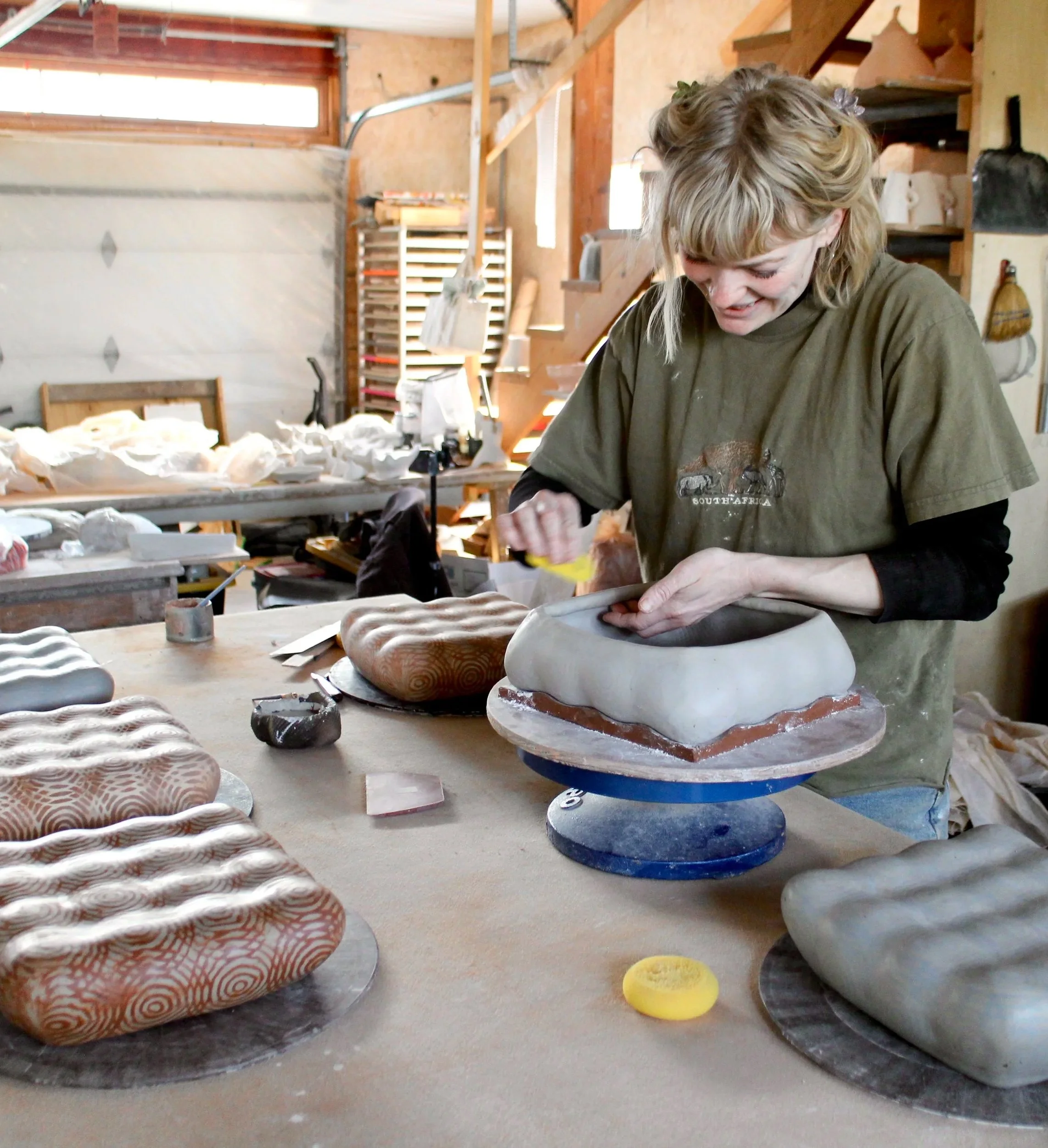 In my slab based work I stretch and push the clay, being guided by the inlaid pattern and discovering how my forms can engage with and transform the pattern. Working this way, I experience a deeper sense of collaboration between myself, clay, and process.